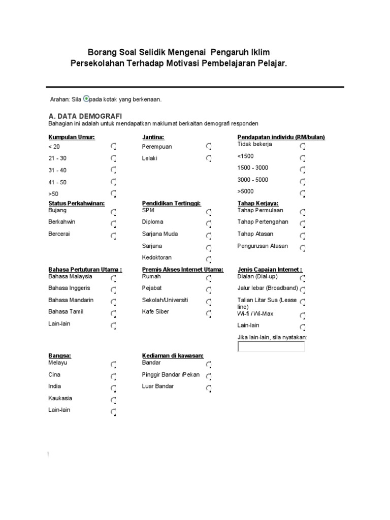 Borang Soal Selidik Anis from imgv2-2-f.scribdassets.com Sektor makanan mempengaruhi industri pelancongan di malaysia. Borang soal selidik ini mengandungi empat bahagian yang terdiri daripada bahagian a, b, c dan d. Yandex.translate is a mobile and web service that translates words, phrases, whole texts, and entire websites from arabic into english. Tekanan kerja di kalangan kakitangan awam di ibupejabat polis kontinjen selangor * borang soal selidik ini hanyalah untuk mendapatkan pandangan dan maklum balas yang akan digunakan. Borang kaji selidik merupakan borang yang berisi soalan dan juga tersedia ruangan untuk jawapan di mana satu sampel borang yang sama digunakan untuk kesemua responden. Menurut gillham (2000), terdapat beberapa sebab mengapa borang soal selidik menjadi pilihan kebanyakkan pengkaji : 0 ratings0% found this document useful (0 votes). Add to collection(s) add to saved.
