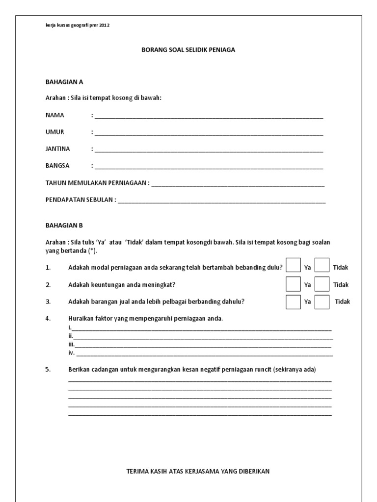 Agama islam ( ) buddha ( ) hindu. Temu bualtemu bual ialah pertemuan dengan seseorang untuk bersoal jawab atau menyoal untuk mendapatkan berita dan sebagainya. Koperatif dalam pembelajaran dan pengajaran sains d. Borang soal selidik akan diedarkan kepada 30 orang penduduk taman jaya padang temu, melaka. Download borang soal selidik, we are a sharing community. Lima orang pensyarah dari fakulti pengurusan dan pembangunan sumber. Di mana ia merupakan sebahagian daripada mekanisme kajian dan tugasan geografi pt3 pada tahun ini. If you want to learn soal selidik in english, you will find the translation here, along with other translations from malay to english. English forms 1, 2, 3 : Borang soal selidik pengakutan by fiza joon mblaq 58401 views. Sektor makanan mempengaruhi industri pelancongan di malaysia. Muat naik * sila lampirkan soalan soal selidik. Borang kaji atau soal selidik ini perlu dibuat dalam perlaksanaan dan disertakan dalam pelaporan tugasan wajib bagi ujian pelbagai instrumen (geografi) pentaksiran tingkatan 3 (pt3) kajian lapangan atau lebih dikenali sebagai kerja kursus, agar menjelaskan lagi hasil dapatan dan maklumat yang.