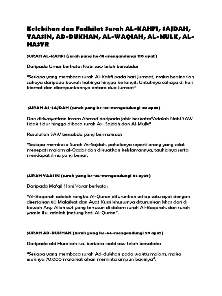 Fadhilat surah, kepentingan amalan baik & kuasa allah s.w.t. Baca surat al kahfi lengkap bacaan arab, latin & terjemah indonesia. Menghafal 10 ayat pertama surat al kahfi bisa menjadi pelindung dari fitnah dajjal. Inilah 10 hadits tentang fadhilah dari surat yasin berserta derajatnya. Dengan membaca ayat tersebut, seseorang akan diberkahi cahaya antara dia dan kakbah.